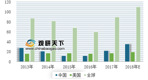 2013-2018年E全球、美國與中國工程機(jī)械銷量對比(單位:萬臺)